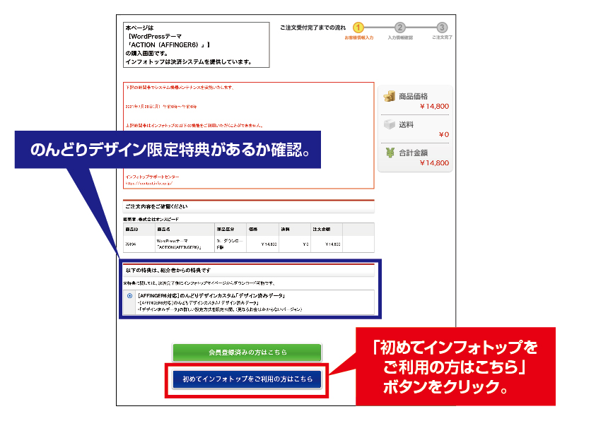 infotop購入ページ利用申請フォームページの「未登録の方はコチラより〜」の文章の中のリンクになっている「コチラ」をクリックする。